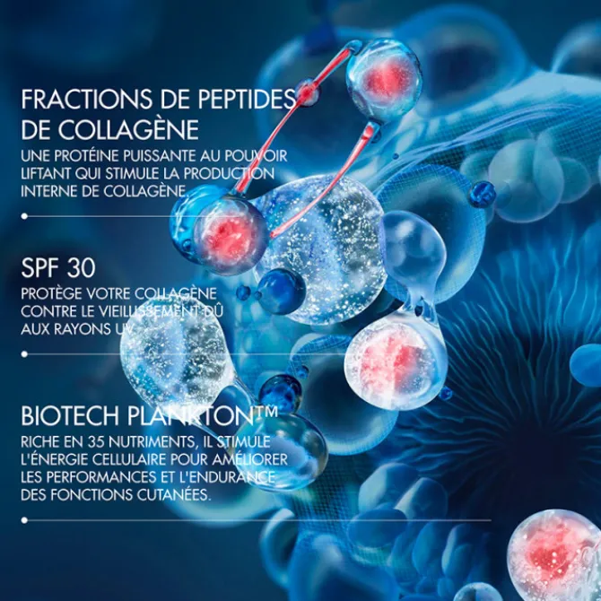 En s’appuyant sur des innovations de pointe en biosciences, le Biotech Plankton™, riche en 35 nutriments, amplifie de 5 fois l’efficacité des Fractions de Peptides de Collagène sur le collagène interne*. Le boost du collagène donne à votre peau le soutien structurel dont elle a besoin pour renforcer la fermeté de la peau en seulement 4 heures** et lifter visiblement la peau***.