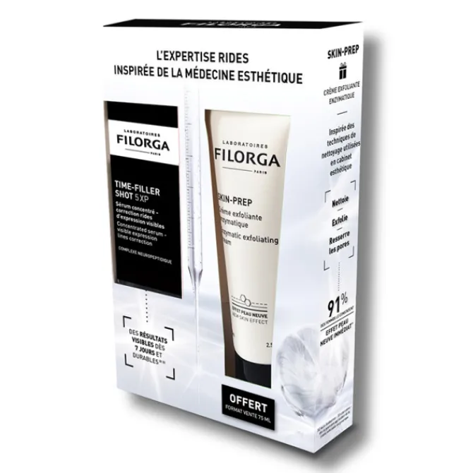 Découvrez un duo de soins expert inspirés de la médecine esthétique : le sérum ciblé TIME-FILLER SHOT 5XP et la crème exfoliante enzymatique format vente OFFERTE !