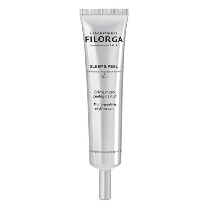Filorga propose le doux peeling visage pour tous.tes ! La formule de la crème resurfaçante de nuit SLEEP&PEEL 4.5 combine les mêmes acides que ceux utilisés en cabinet, dans une concentration cosmétique unique, pour assurer une action exfoliante en douceur visible dès le premier réveil et une haute tolérance pour toutes les peaux, même les plus sensibles. Qui dort, peel !