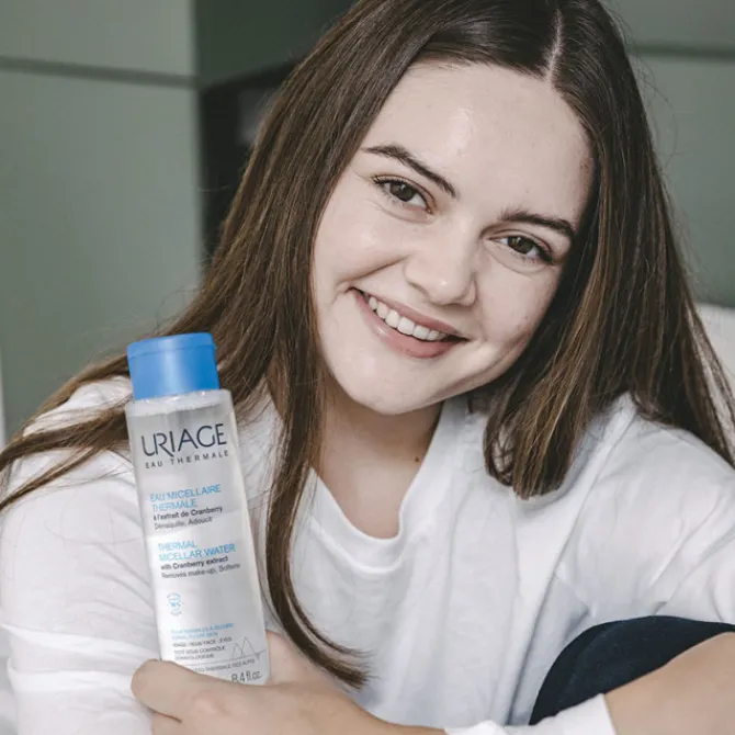 Imbibez un coton d’Eau Micellaire Thermale et passez délicatement sur le visage, les yeux et le cou pour nettoyer, sans rinçage. Parfaire le démaquillage des yeux avec le Démaquillant Yeux Waterproof. Vaporisez de l’Eau Thermale d’Uriage sur l’ensemble du visage et laissez pénétrer. Ne pas sécher. Terminez en appliquant votre soin quotidien.