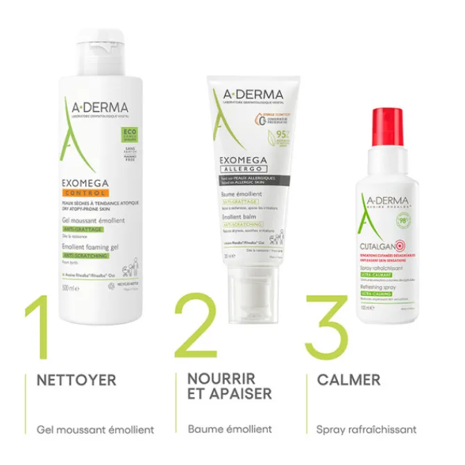 Etape 1 Avant d’appliquer le baume, nettoyer préalablement la peau avec un produit d’hygiène EXOMEGA CONTROL. Etape 2 Verser le baume dans les mains. Le réchauffer entre les mains. Etape 3 Appliquer le baume en larges mouvements.