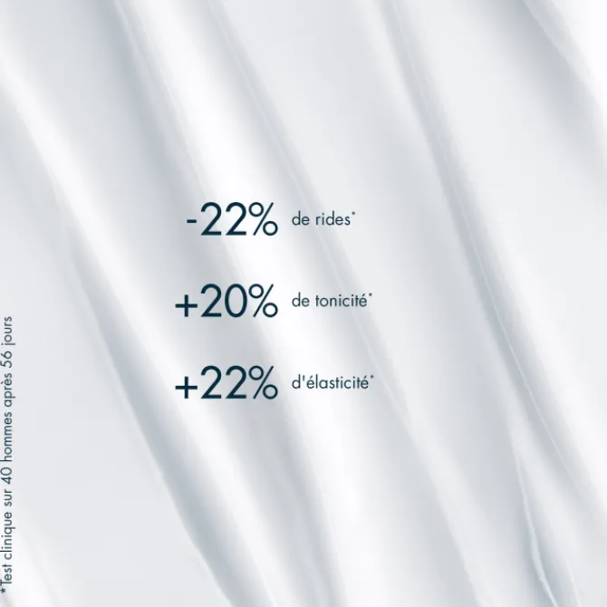 Après seulement 4 semaines, la peau bénéficie de : -22% de rides* +20% tonicité* +20% élasticité* Résultats de test : – 96% des hommes affirment que leur peau paraît plus ferme** – 94% des hommes affirment que la texture de leur peau semble affinée** – 92% des hommes affirment que leurs rides sont visiblement lissées** *Résultats d’une étude clinique sur 50 hommes après 7 jours **Auto-évaluations de 50 hommes après 56 jours