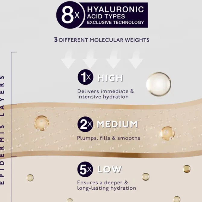 – 8 Types D’acides Hyaluroniques Technologie Exclusive: combinant trois poids moléculaires différents, elle hydrate en profondeur, repulpe le contour des yeux, comble les rides et ridules et estompe les imperfections, offrant une hydratation et un confort intenses.