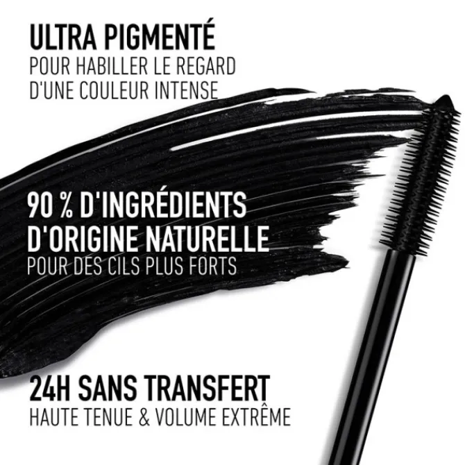Signature du mascara, le flacon en élastomère souple se presse 1 à 2 fois avant l’application pour fluidifier la texture du mascara et la répartir idéalement sur la brosse volumatrice.