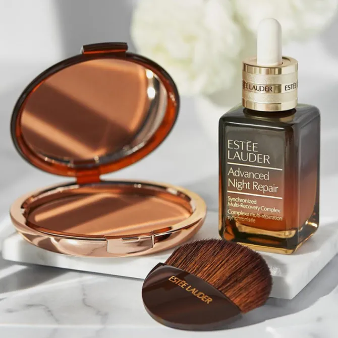 Notre astuce pour un teint hâlé subtilement structuré : appliquez la poudre de soleil Bronze Goddess en formant le « E » d’Estée Lauder.