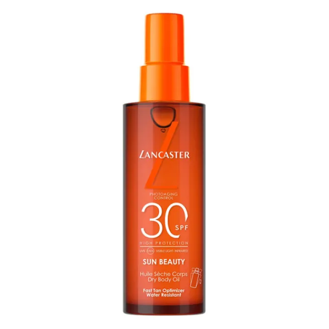 Protégez votre peau au-delà des soins UV traditionnels avec l’Huile Sèche Corps Sun Beauty SPF30, signée Lancaster, la première marque de soins solaires de luxe en Europe1.